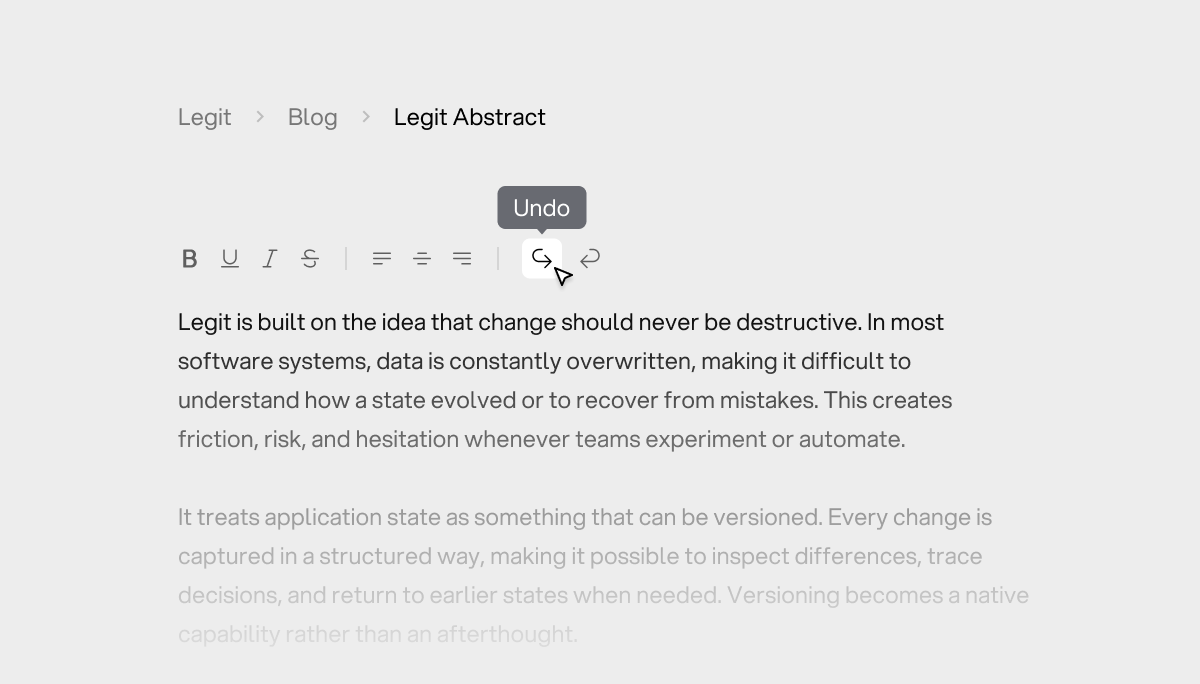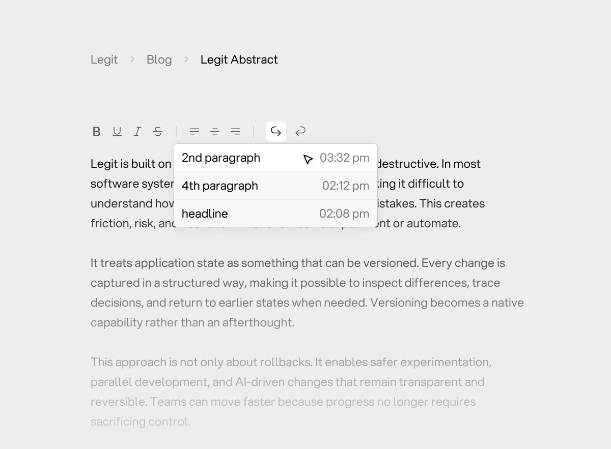 Today, multiple agents (humans, AI assistants, collaborators, background processes) simultaneously edit shared documents. The linear stack model that powers every text editor, design tool, and collaborative app becomes not just inadequate—it becomes actively harmful to user experience, creating unpredictable behavior that makes users feel like they've lost control.
