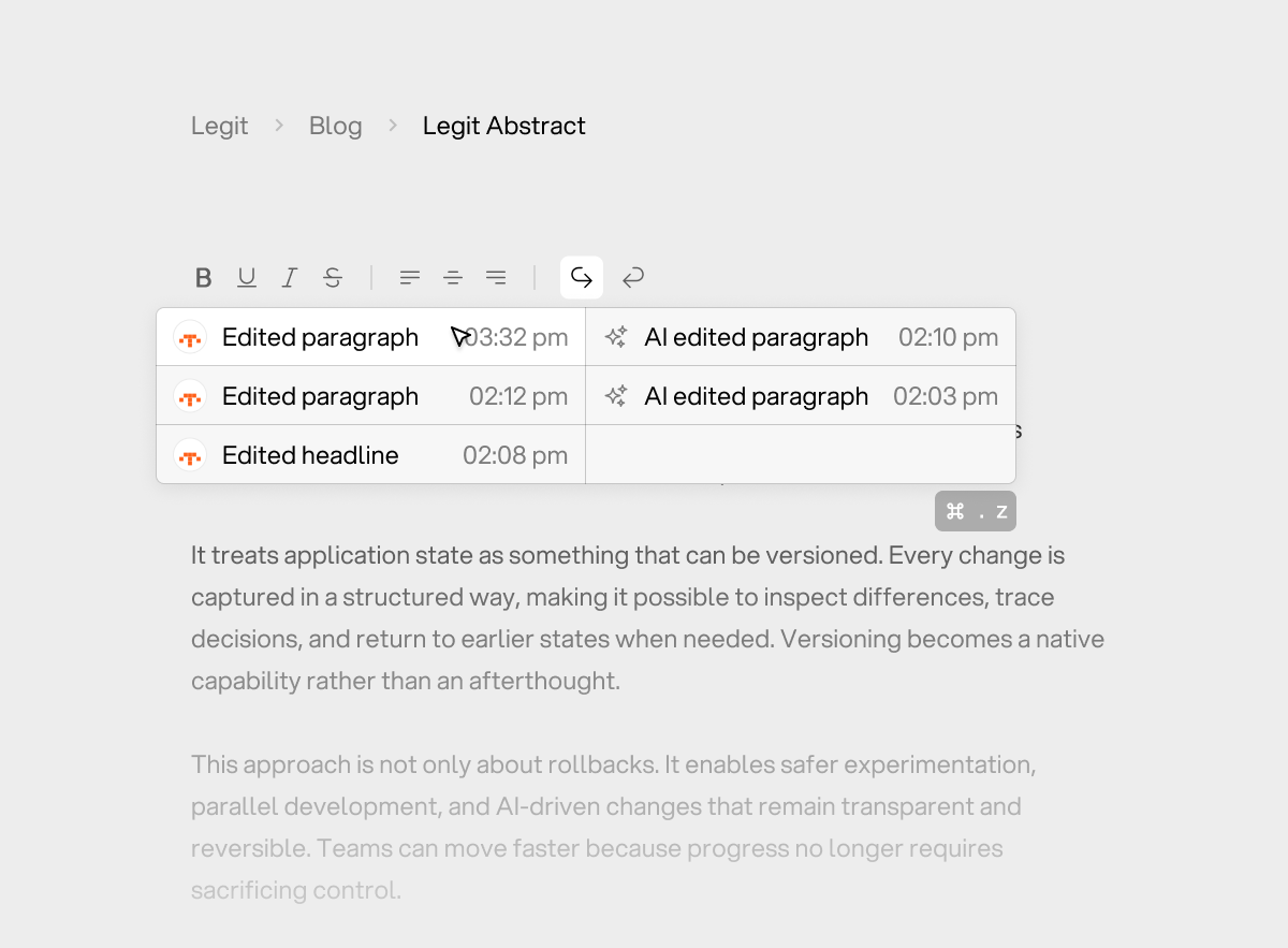 As someone who's spent years building collaborative editing systems and watching AI transform how we interact with documents, I've watched users hit Ctrl+Z expecting predictable behavior and instead get something that erodes trust. The undo/redo mechanism, one of the most fundamental user interface conventions we inherit from the 1970s, assumes a world that no longer exists: one person editing one document at a time.